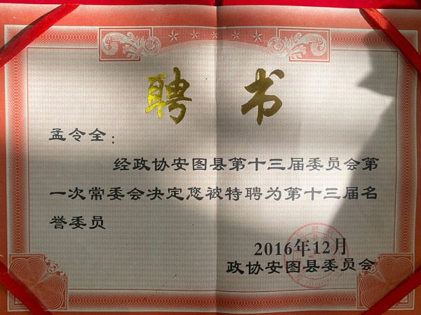 证书名称: 安图县第十三届名誉委员