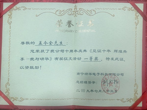 证书名称: 南宁研华科技荣誉证书