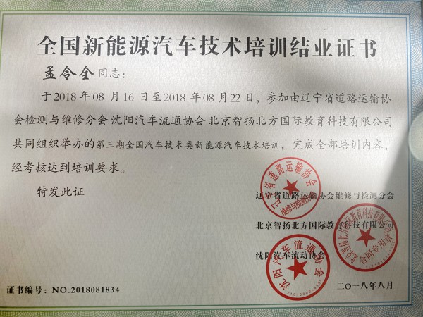 证书编号: 0011 证书名称: 全国新能源汽车技术培训 发证机构: 辽宁省道路运输协会;沈阳汽车流通协会 生效日期: 2018年08月01日 截止日期: 2028年08月08日 认证简介: