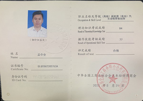 证书编号: 0010 证书名称: 新能源汽车诊断维修技师 发证机构: 中华全国工商业联合汽车经销商商会 生效日期: 2023年05月31日 截止日期: 2033年05月31日 认证简介: